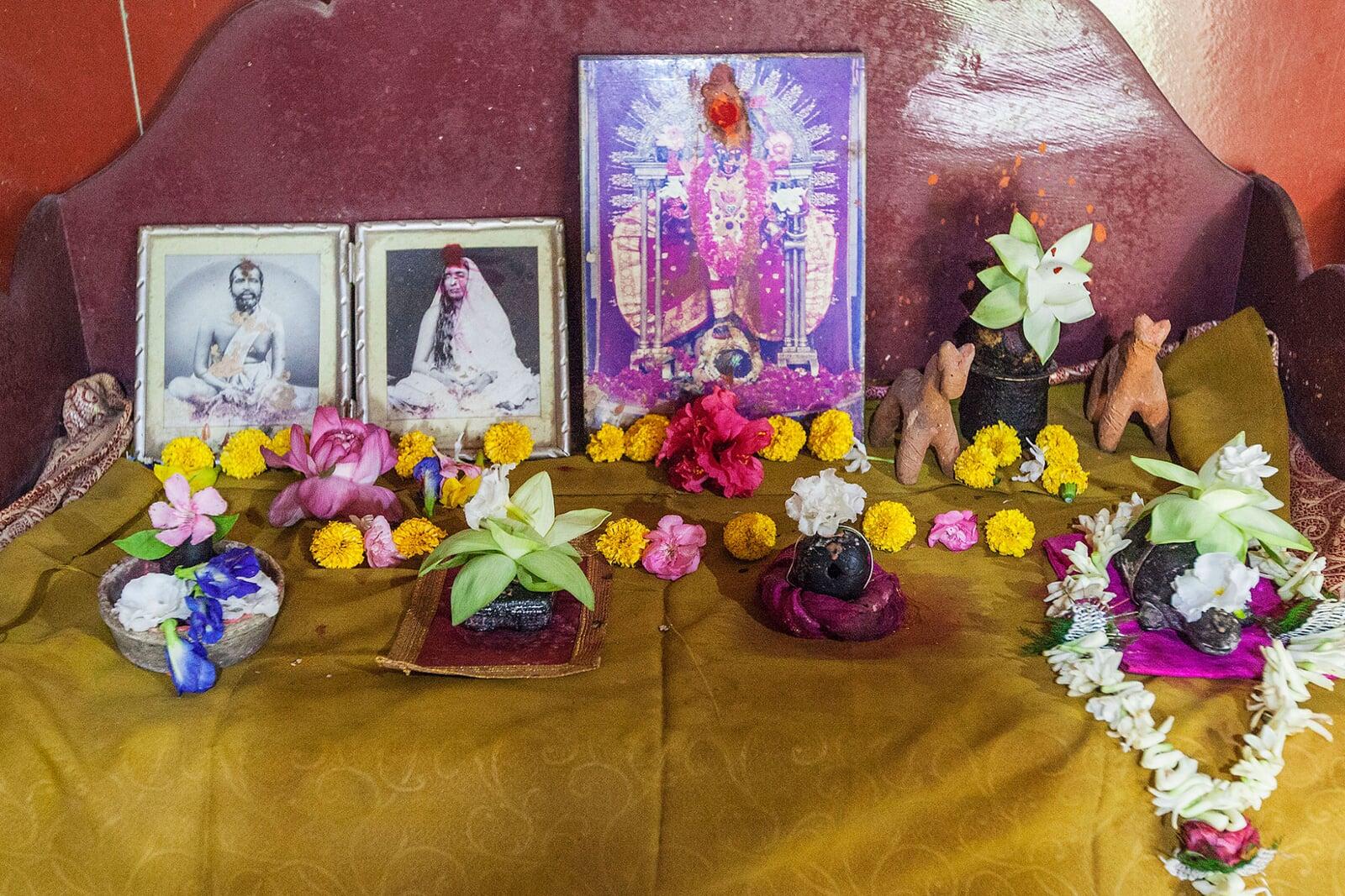 Sundar Narayan Dharma-Thakur, who is the ancestral Deity of Ramchandra Mukhopadhyay, enshrined in a small mud- walled thatched house consisting of two rooms. He is worshipped under two different names at two separate places. His temple is located on the north-western corner of the Punya-Pukur. In one of the rooms, there is the tortoise-shaped Dhama-Thakur named Sundar Narayana who is still worshipped by Sri Sri Matri Mandir and members of the Mukherjee-family by turns, along with Sitala Devi and the stone-emblem of Narayana installed therein. The Goddess Kali was worshipped in the adjoining room, but it has been discontinued for good. There is another temple of Dharma-Thakur named 'Yatra-Siddhi Ray' who is the village Deity. It stands at the western end of the village in front of the Mother's Ghat.